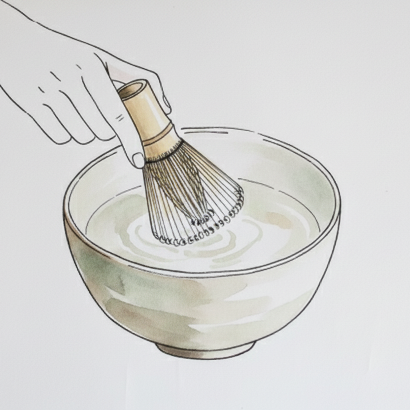 Giet ongeveer 50 ml water van 70–80°C bij de matcha. Whisk vervolgens in een W- of M-vorm, niet rondjes, gedurende 20–30 seconden.