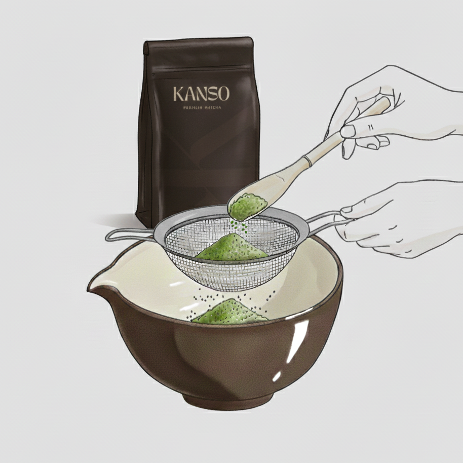Gebruik een chashaku of een theelepel en doseer ongeveer 2 gram matcha. Zeef de matcha bij voorkeur boven je kom.